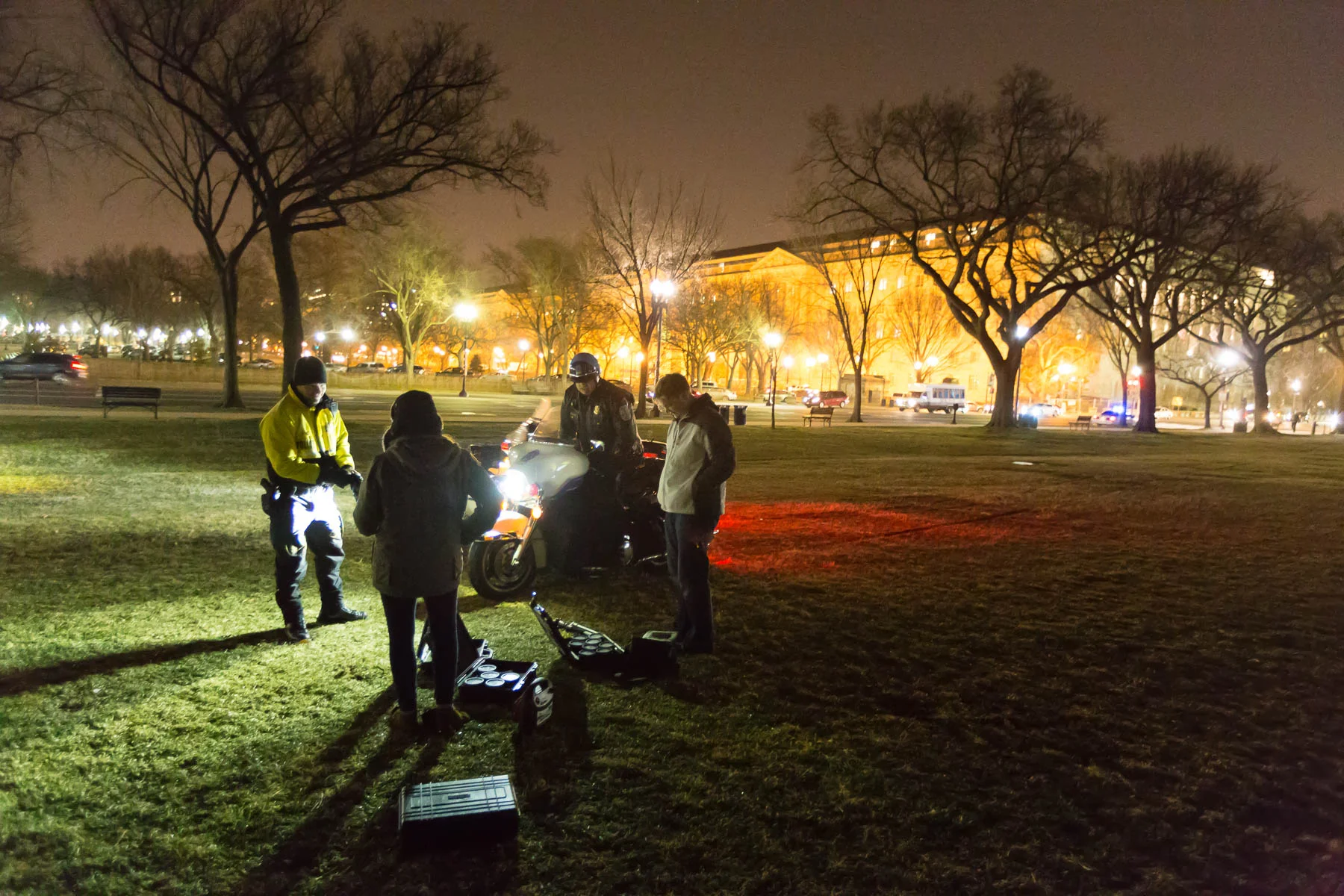 Although the second cop left us with a seal of approval, he was followed still by a barrage of even more police. One officer, from the parks department, asked, "do you all have a permit to be here?" "No," we said half-heartedly, "do we need to have one?" "I don't know," retorted the cop, "I was just curious." Then, after chatting a bit, giving more explanation about our project, and even letting the cops inspect all of our lights and bags, a secret service cop piped up… "let me make this perfectly clear," he spoke with authority, but was kind, "there is absolutely nothing wrong with you being here. You are not breaking any laws by being here. You can be here with these lights and you can make art here!" "However," he continued, "if you don't move this van to the other side of the monument, we will be out here harassing you all night." Another cop chimed in- "yeah, this is just really bad timing on your part. Do you know what tonight is?" "Of course," we all responded, "we thought this was the perfect place and time for us to get a lot of people involved in our project."